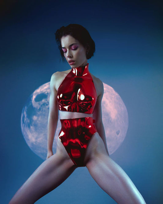 LACQUERED CHROME ACRYLIC ANATOMICAL BREASTPLATE & BIKINI BOTTOM IN RED
