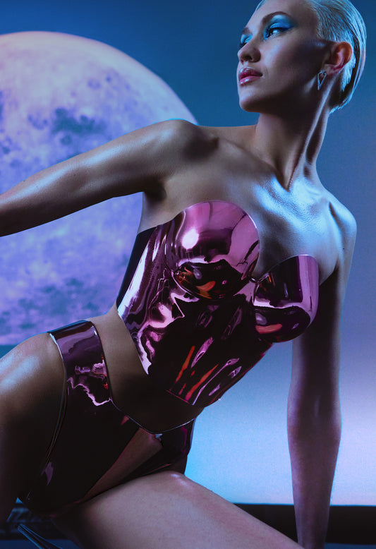 LACQUERED CHROME ACRYLIC ANATOMICAL BREASTPLATE & BIKINI BOTTOM IN PINK