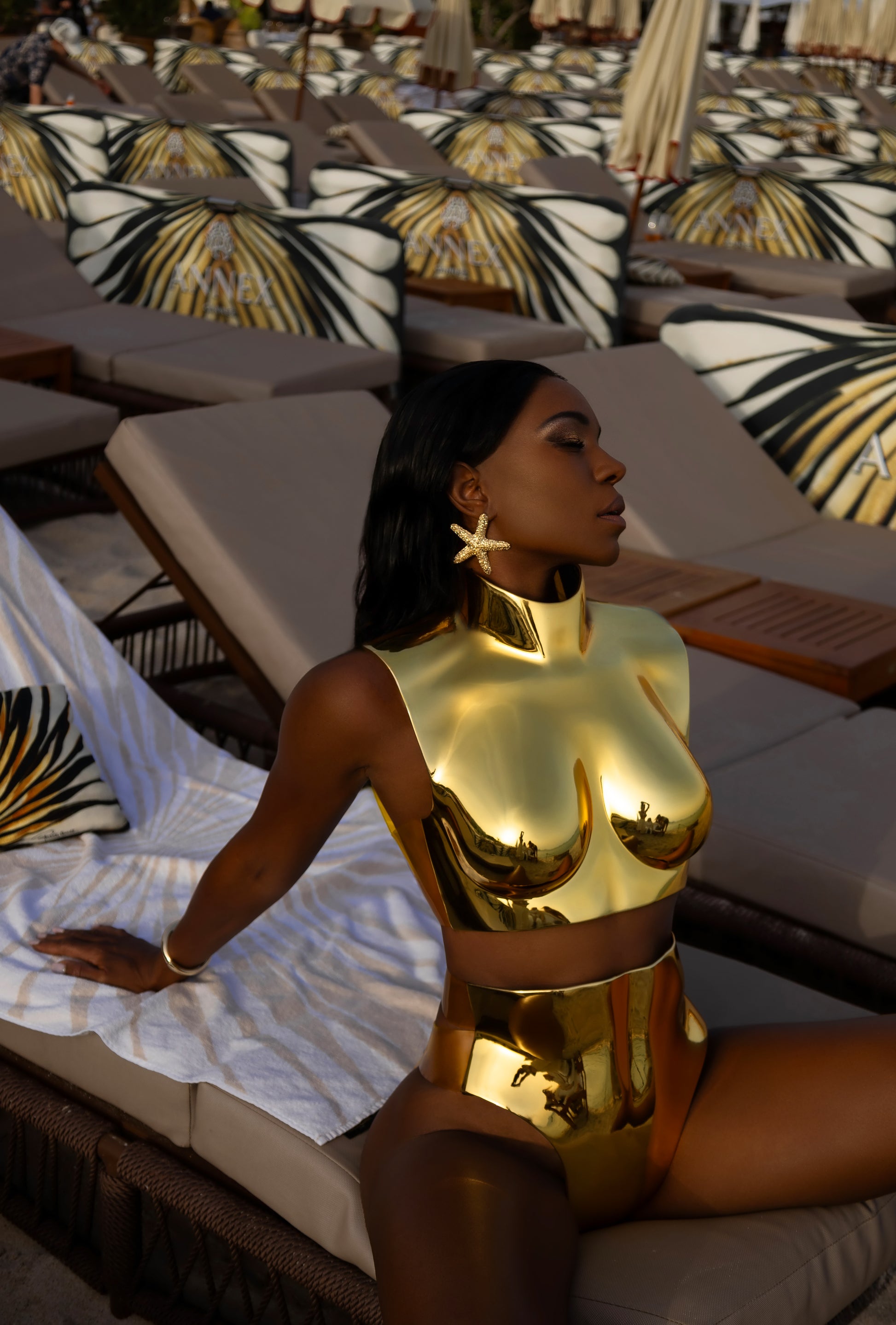RUNWAY CHROME ACRYLIC BREASTPLATE & BIKINI BOTTOM IN GOLD — LUXURY STATEMENT BODYWEAR
