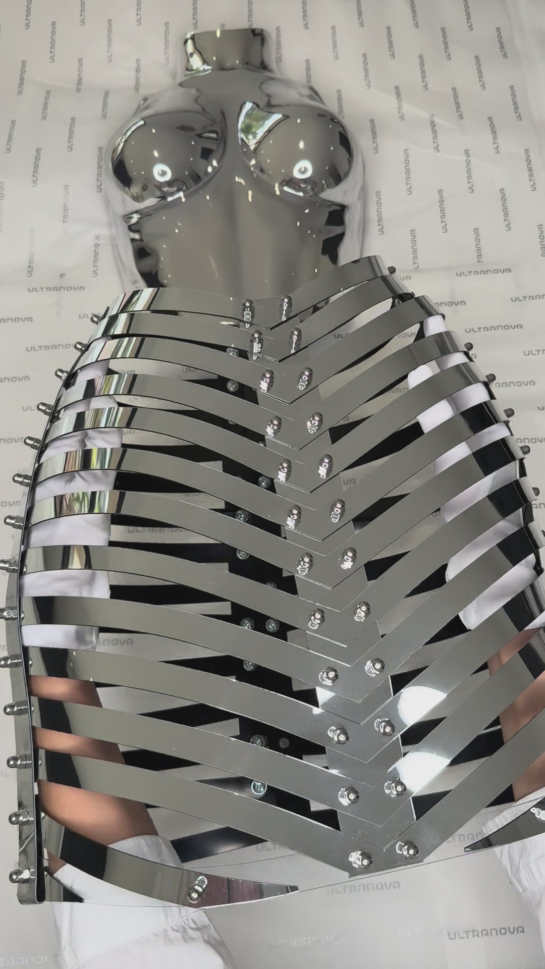 MUSEUM-GRADE CHROME BODY SCULPTURE — EXCLUSIVE FASHION BREASTPLATE & SKIRT IN SILVER